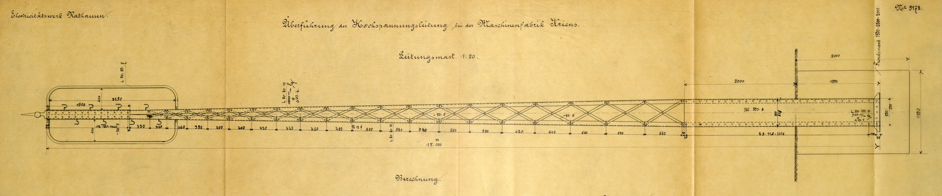 Maschinenfabrik Bell, Pläne alte Leitungsmasten: Elektrizitätswerk Rathausen: Überführung der Hochspannungsleitung bei der Maschinenfabrik Kriens, ca. 1899 - 1904 (PA 376/1332.10)