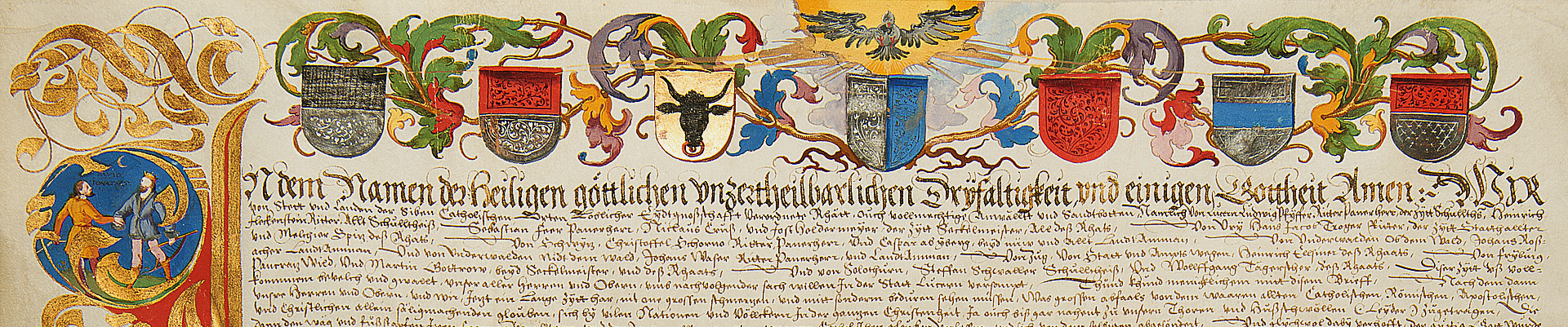 Goldener oder Borromäischer Bund: Bündnis der 7 katholischen Orte Luzern, Uri, Schwyz, Unterwalden, Zug, Freiburg und Solothurn zur Aufrecherhaltung des katholischen Glaubens, 1586 (URK 52/1064)